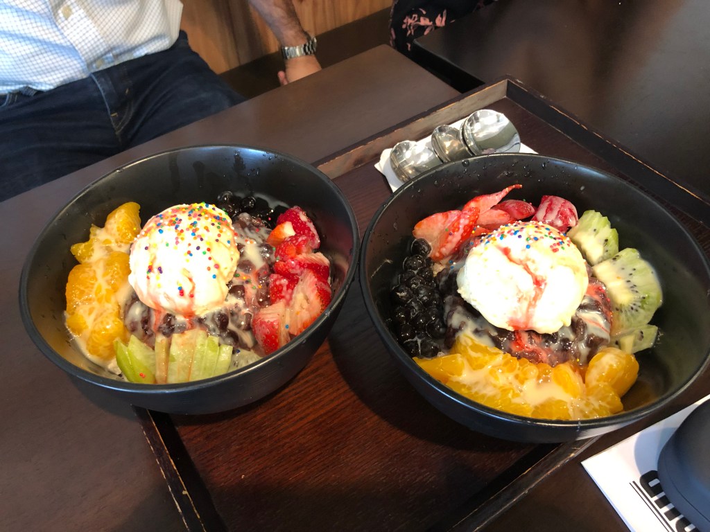 Our next stop was Tea Zone Bakery & Cafe. It was a 30 second drive across the Microcenter parking lot. We were there to sample the Bingsoo, a yummy shaved ice/ice cream/fruit/tapioca dessert, but they had oolong tea and baked goods to take home, so we had to do a little extra shopping. The rice flour donut with red bean paste in the center is especially good, and the kids liked the mocha cake we got for them. We really enjoyed the Binsoo – definitely something you want to split with at least one other person, though. A really nice summer treat.